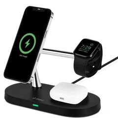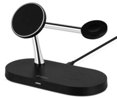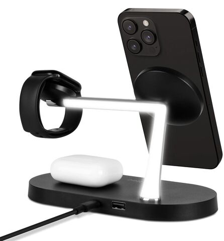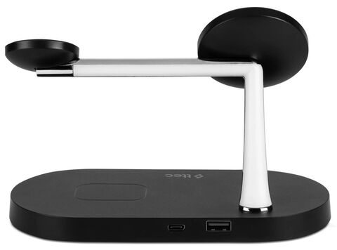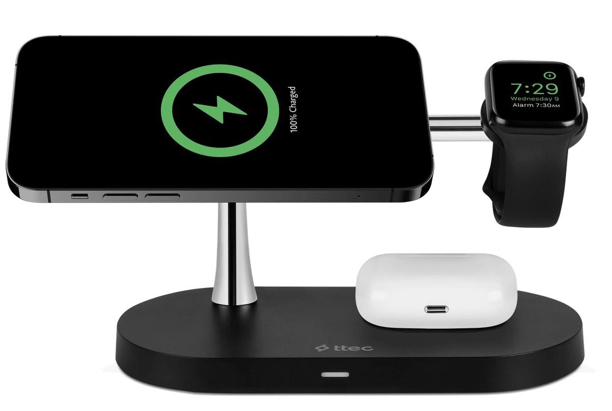 TTEC AirCharger Quattro M — универсальная беспроводная станция 4-в-1 с поддержкой MagSafe, созданная для владельцев техники Apple. Одновременно заряжает iPhone, Apple Watch и AirPods, а дополнительный выход USB-A на 10 Вт позволяет подпитать ещё одно устройство проводом — например, планшет или смартфон без MagSafe. Мощность распределена оптимально: iPhone — до 7,5 Вт, AirPods — 2 Вт, Apple Watch — 3 Вт. Компактная и аккуратная, она заменяет несколько зарядок на столе и держит всё в порядке.