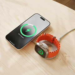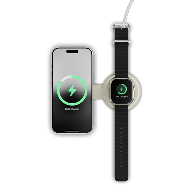 Два в одном зарядном решении Избавьтесь от беспорядка при зарядке с помощью одного элегантного устройства, которое одновременно заряжает ваш iPhone и Apple Watch. Универсальное беспроводное зарядное устройство OntheGo 2-в-1 служит полноценной зарядной станцией, уменьшая путаницу с кабелями и экономя драгоценное пространство дома, в офисе или во время путешествий. Его продуманный дизайн поддерживает все ваши основные устройства Apple в одном компактном корпусе.
