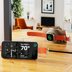 Несколько положений для зарядки. Адаптируйтесь к любой среде благодаря гибким положениям для зарядки, которые соответствуют вашим потребностям. Разместите iPhone в горизонтальном положении для просмотра видео, в режиме ожидания для персонализации дисплея или горизонтально для простой зарядки. Ваши Apple Watch можно разместить горизонтально или в режиме Nightstand, превращая зарядное устройство в удобные прикроватные часы. Эта универсальность обеспечивает комфортное использование в любой обстановке, от офисного стола до тумбочки в отеле.
