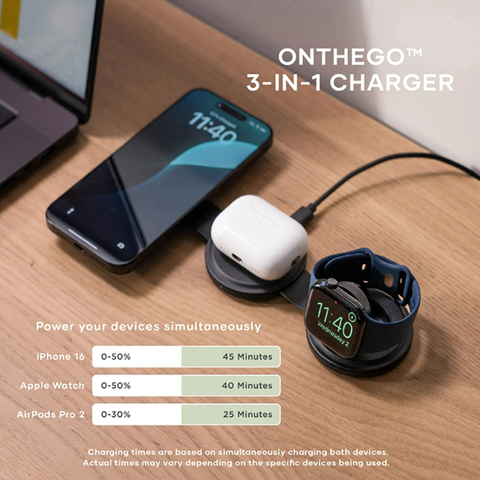 1 зарядное устройство OntheGo 3-в-1, 1x 1M USB-C-USB-C кабель 1x Дорожный чехол 1x Руководство по продукту