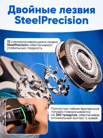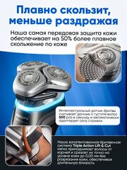 Система бритья Triple Action Lift&Cut позволяет срезать волоски на уровне кожи, даже в труднодоступных местах. Благодаря компактной головке 360° Precision Flexing, бритва легко адаптируется к контурам лица и обеспечивает гладкое бритье.