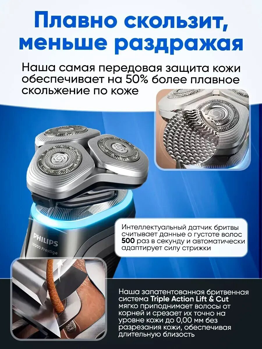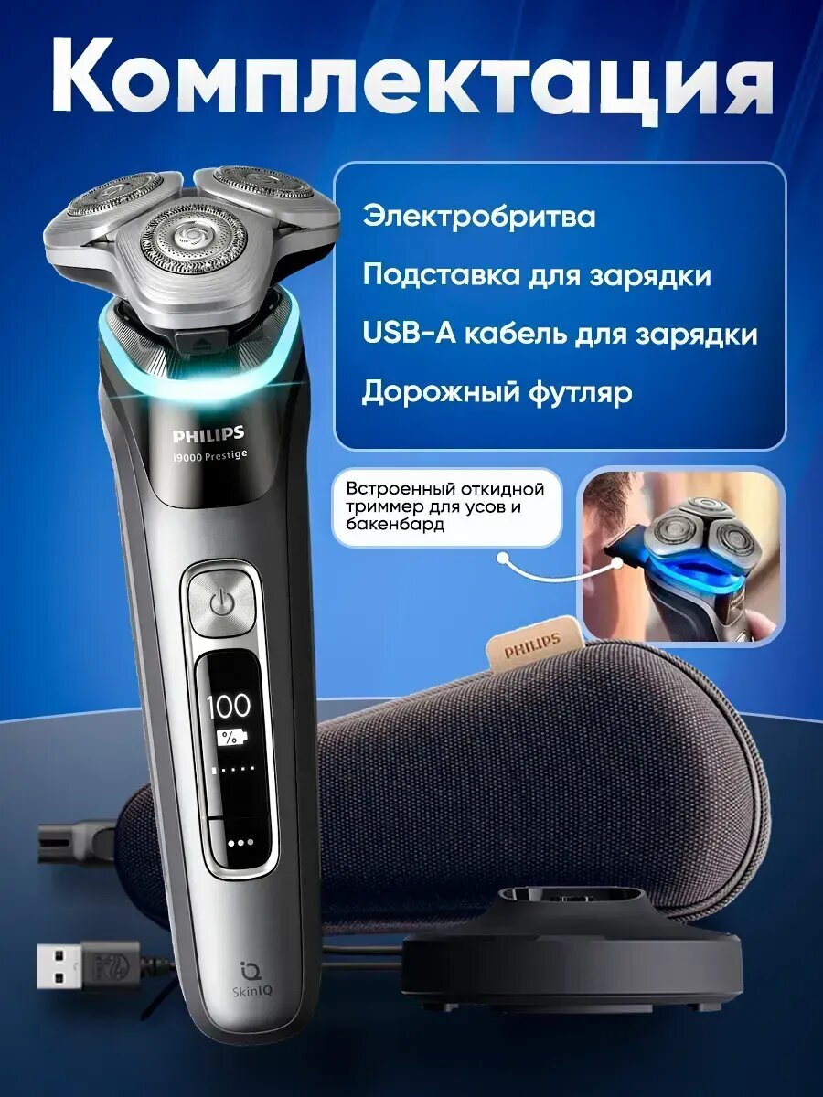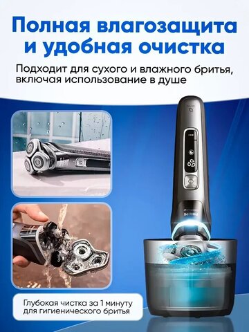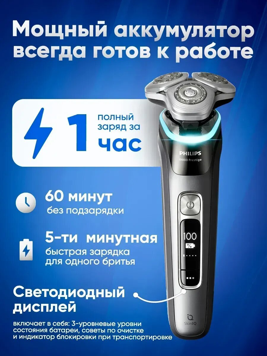 Электробритва Philips I9000 Prestige оснащена четырьмя бреющими элементами, плавающими головками и подвижным бритвенным блоком. Водонепроницаемый корпус позволяет использовать устройство как в душе, так и в ванной.