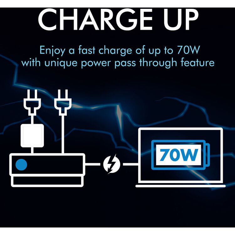 Заряжайте Mac или другой ноутбук мощностью до 45 Вт через Thunderbolt 3 (до 30 Вт при последовательном подключении других устройств) и даже до 70 Вт сквозной мощности при использовании блока питания ноутбука.