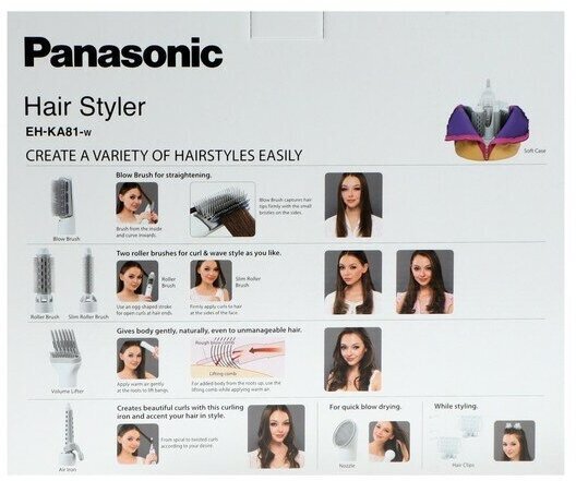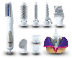 Бесшумный 59 дБ в режиме сушки. Наслаждайтесь широким выбором стилей. С помощью 6-ти насадок и 2 зажимов для волос вы можете легко создавать разнообразные прически с помощью одного стайлера. Выдувная щетка с маленькой расческой. Резина с обеих сторон щетки захватывает кончики волос предотвращая их выпадение. Благодаря постоянному натяжению волос это обеспечивает более эффективной выдув для лучшей укладки. Средство для придание объема для упругого покрытия. В то время, как подъемная расческа приподнимает волосы у корней, теплый воздух мягко подается длинной выдувной расческой для придания объема от корней вверх. Для бесшумной работы стайлер оснащен улучшенной внутренней конструкцией. Двойной обдув для регулирования воздушного потока, фиксированный зазор между вентилятором и корпусом и высокоэффективный вентилятор для главного обдува снижают шум при работе. КомплектацияФен- щетка, насадки 8 шт, документация |