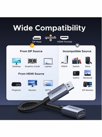 Преобразите возможности подключения вашей техники с помощью компактного и высокоэффективного переходника UGREEN DP133. Это идеальное решение для бесшовного соединения современных устройств, оснащённых разными видеоинтерфейсами. Благодаря этому кабелю вы легко сможете передавать изображение и звук с компьютера, ноутбука или другого источника, имеющего выход DisplayPort, на телевизор, монитор, проектор или иную технику с входом HDMI.