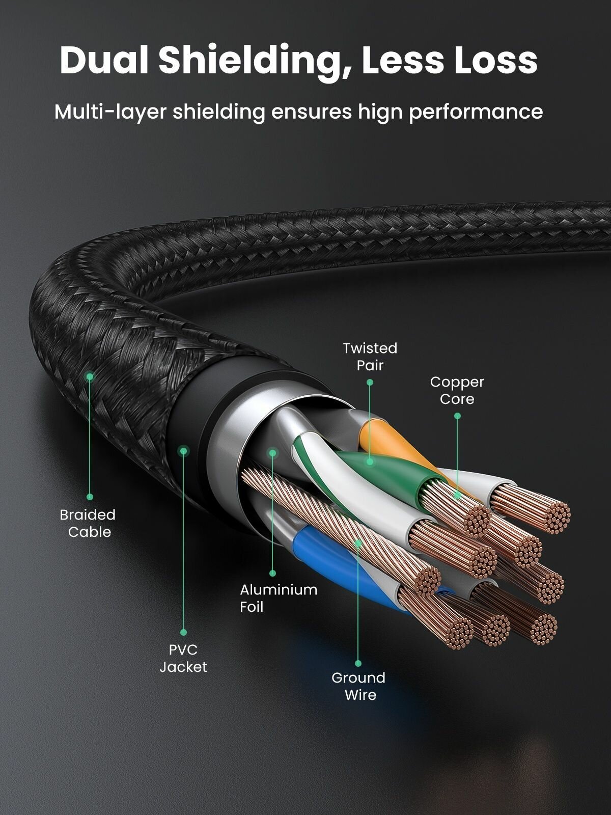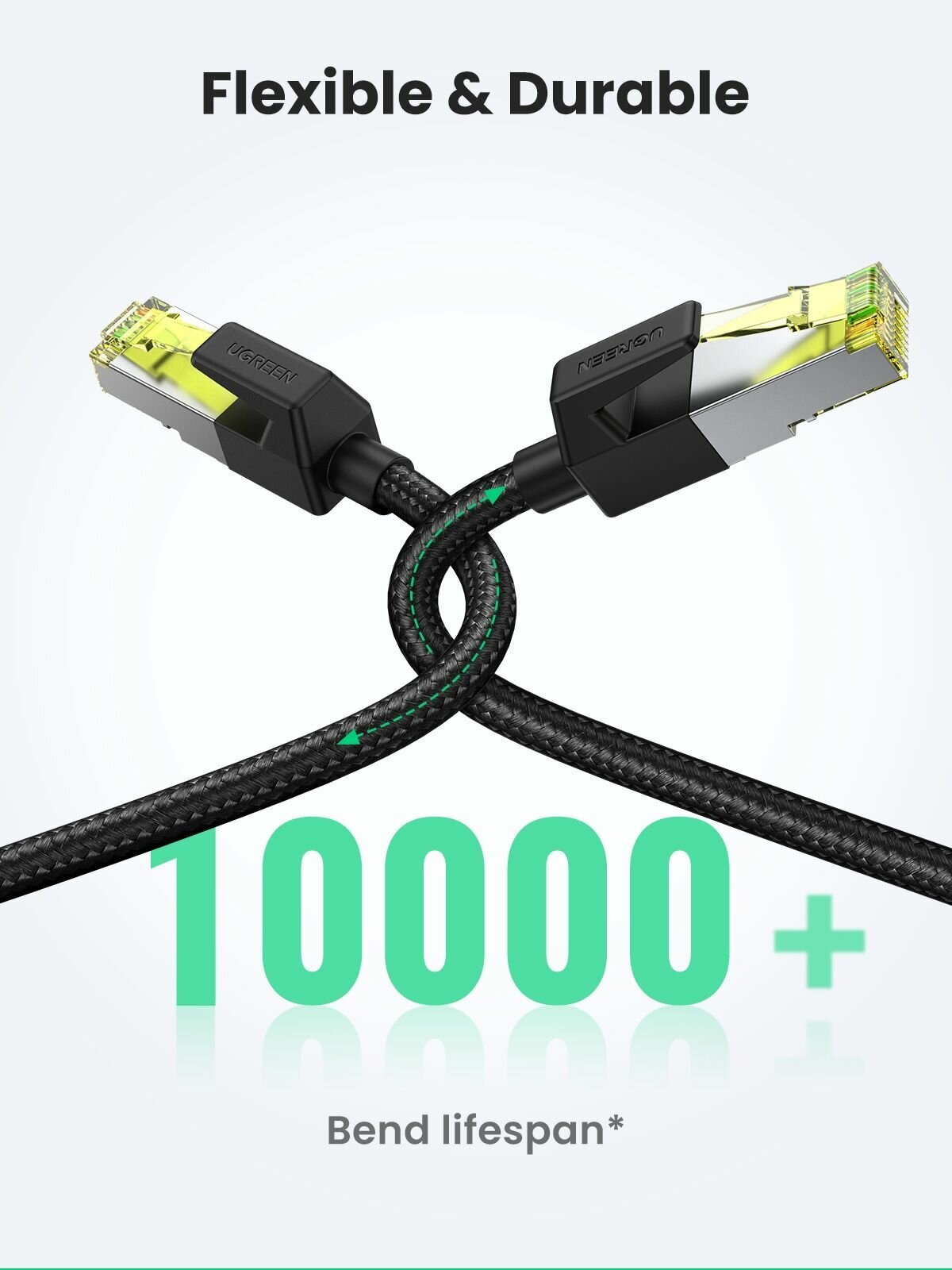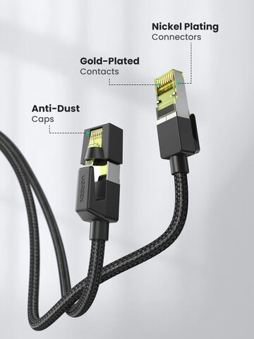 Кабель UGREEN NW150 оснащен позолоченными модульными вилками с 3 контактами, которые устойчивы к ржавчине и окислению. Двухслойное экранирование с использованием F/FTP технологии блокирует помехи и обеспечивает стабильную работу.