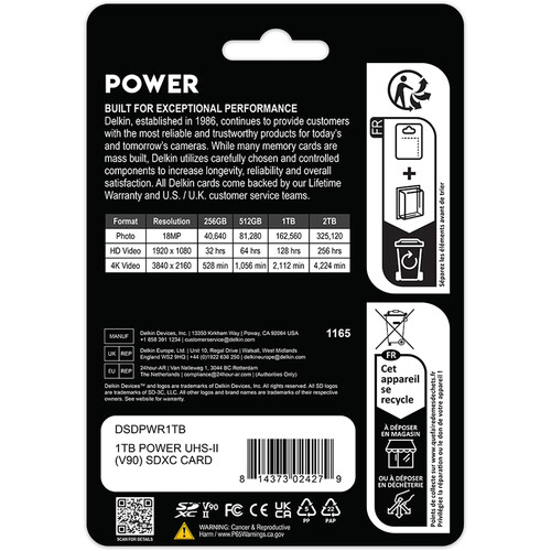 Карта памяти POWER UHS-II SDXC объемом 1 ТБ от Delkin Devices , разработанная для профессиональных фотографов и видеооператоров, поддерживает максимальную скорость чтения 300 МБ/с и максимальную скорость записи 250 МБ/с благодаря шине UHS-II. Карта также соответствует классу скорости видео V90, гарантирующему минимальную скорость записи не менее 90 МБ/с. Все это позволяет пользователям снимать видео в формате 8K, 4K, 3D, HDR, вести высокоскоростную и высокочастотную запись, а также записывать несколько видеопотоков с 360° камер. Карта также одобрена для трансляции в реальном времени и поддерживает одновременную съемку ресурсоемких файлов, таких как RAW и JPEG, а также видео, фото, GPS-данные и таймлапс.