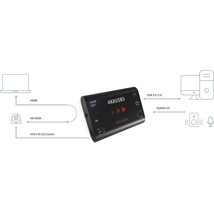 Карта видеозахвата Inogeni 4K Ultra HDMI - USB 3.0позволяет захватывать несжатое видео со звуком с выхода HDMI камеры на ПК или через аналоговый аудиоразъем 3,5 мм для приложений записи, редактирования, видеоконференций и потоковой передачи. Установка драйвера не требуется, и он будет работать на всех материнских платах и чипсетах USB 3.0. Он имеет вход HDMI, сквозной выход HDMI и выход USB 3.0. Компактный размер и питание непосредственно от порта USB 3.0, преобразователь представляет собой практичное и простое в использовании решение для захвата данных через USB 3.0. Он совместим с операционными системами Windows, Mac OS X, Linux и Android, а также UVC-совместим, поэтому он будет работать со всем программным обеспечением, совместимым с DirectShow. Эта карта захвата обратно совместима с устройствами USB 2.0. Однако из-за ограничений пропускной способности карта сможет работать только с разрешением ниже 1080p.