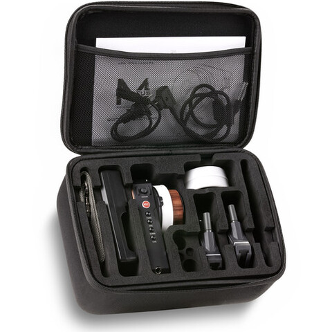 Этот комплект представляет собой двухкоординатную систему, обычно управляющую фокусом и диафрагмой, но пульт управления позволит вам управлять дополнительным мотором (не входит в комплект) для управления зумом при использовании зум-объектива. Система может осуществлять беспроводную регулировку фокуса на расстоянии до 300 метров, а батареи обеспечивают работу пульта управления примерно в течение 10 часов на одном заряде (батареи не входят в комплект). Первый двигатель питается от входящего в комплект кабеля D-Tap — 7-контактный; второй двигатель подключается к рукоятке последовательно с помощью кабеля 7-контактный — 7-контактный для питания. Ремешок крепится к блоку управления, позволяя носить его на шее.