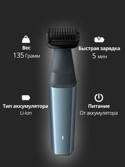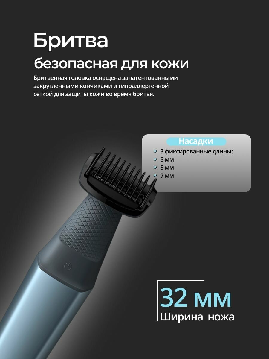 Безопасное и комфортное бритье для вашей нежной кожи.Бритвенная головка имеет запатентованные закругленные кончики и гипоаллергенную сетку, защищающую кожу от порезов и царапин во время бритья. Двунаправленный триммер и насадка-гребень для стрижки во всех направлениях.В комплект системы для бритья входят 3 сменные насадки-гребня для стрижки на 3 мм, 5 мм и 7 мм, или же можно использовать систему без гребня для более гладкой стрижки. 100% водостойкий триммер для телаВаш триммер для тела, подходящий как для сухого, так и для влажного использования, полностью водонепроницаем, поэтому вы можете использовать его как в душе, так и вне его, а также легко чистить. Для достижения наилучших результатов используйте его на сухих волосах перед принятием душа. 60 минут работы без проводов и быстрая зарядка за 1 час.Мощный перезаряжаемый аккумулятор для использования на всем теле, обеспечивающий 60 минут автономной работы. Благодаря функции быстрой зарядки, вы можете снова использовать прибор после 5 минут зарядки. Эргономичная рукоятка для дополнительного контроля при уходе за собой.Ваш триммер для тела удобен в использовании и легко управляется, а эргономичная прорезиненная рукоятка обеспечивает более точный контроль во время стрижки. Триммер для тела, рассчитанный на длительный срок службы и не требующий использования масла.Все наши средства для ухода за телом созданы для долговечного использования. На них предоставляется 2-летняя гарантия, и их никогда не нужно смазывать маслом. |