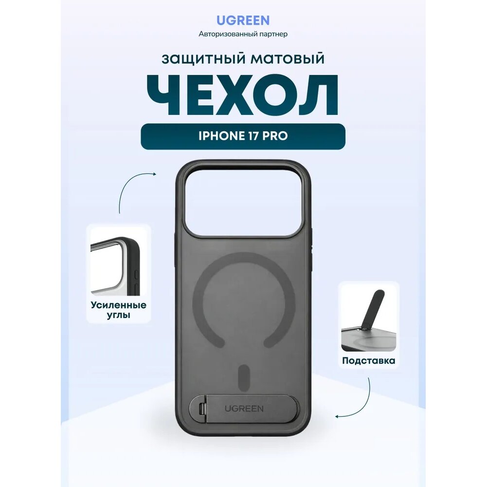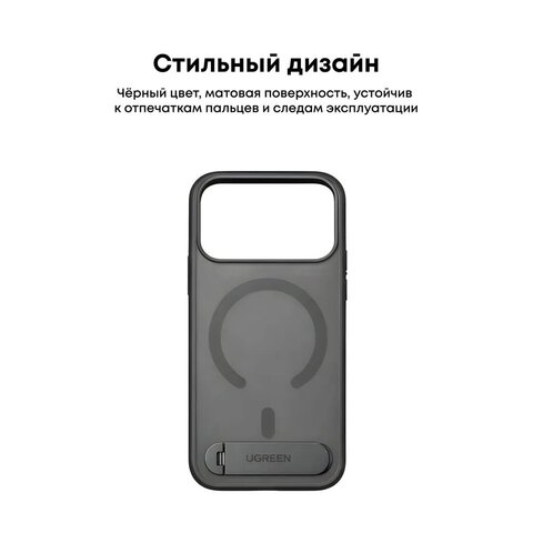 | UGREEN CA317 — защитный чехол с магнитным кольцом и встроенной подставкой для iPhone 17 Pro Max Чехол UGREEN CA317 разработан специально для iPhone 17 Pro Max и сочетает надёжную защиту корпуса с продуманной функциональностью для повседневного использования. Конструкция чехла точно повторяет геометрию смартфона, обеспечивая плотную посадку и уверенную фиксацию без люфтов и смещений. Корпус выполнен из прочного материала, устойчивого к механическим воздействиям. Усиленные углы и приподнятые бортики вокруг экрана и блока камер помогают защитить устройство от царапин и повреждений при падениях и контакте с поверхностями. На задней панели размещено встроенное магнитное кольцо, совместимое с магнитными аксессуарами и беспроводной зарядкой. Магниты обеспечивают стабильное удержание смартфона и корректное позиционирование при использовании зарядных устройств и автомобильных держателей. В нижней части корпуса интегрирована складная металлическая подставка, аккуратно встроенная в дизайн чехла. Подставка позволяет устанавливать смартфон в вертикальном или горизонтальном положении — удобно для просмотра видео, видеозвонков, навигации и работы без необходимости держать устройство в руках. В сложенном состоянии подставка плотно прилегает к корпусу и не мешает эксплуатации. Чехол сохраняет полный доступ ко всем кнопкам, портам и динамикам, не ограничивая функциональность смартфона. |